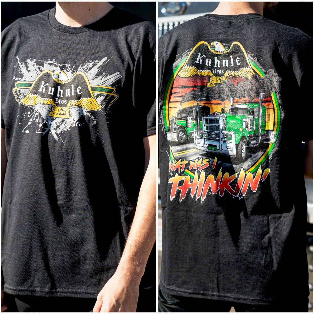 Kuhnle Brothers logo on front of t-shirt; What Was I Thinkin' and ShopTime Trucks featured on the back of t-shirt.